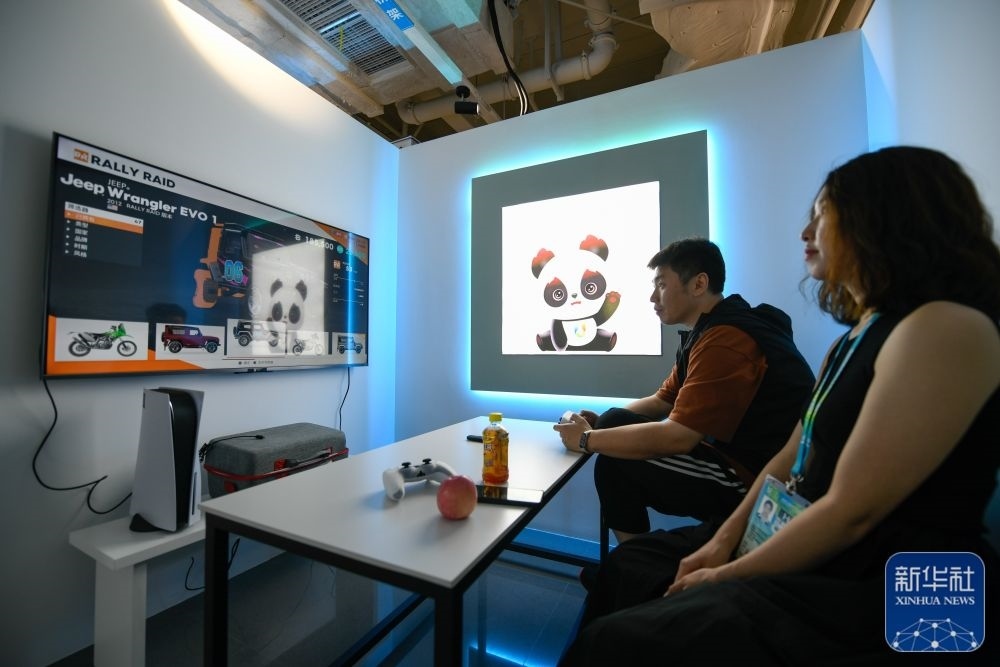↑7月14日,媒體工作人員在成都大運會主媒體中心休閑娛樂區(qū)內(nèi)游玩。新華社記者 胥冰潔 攝