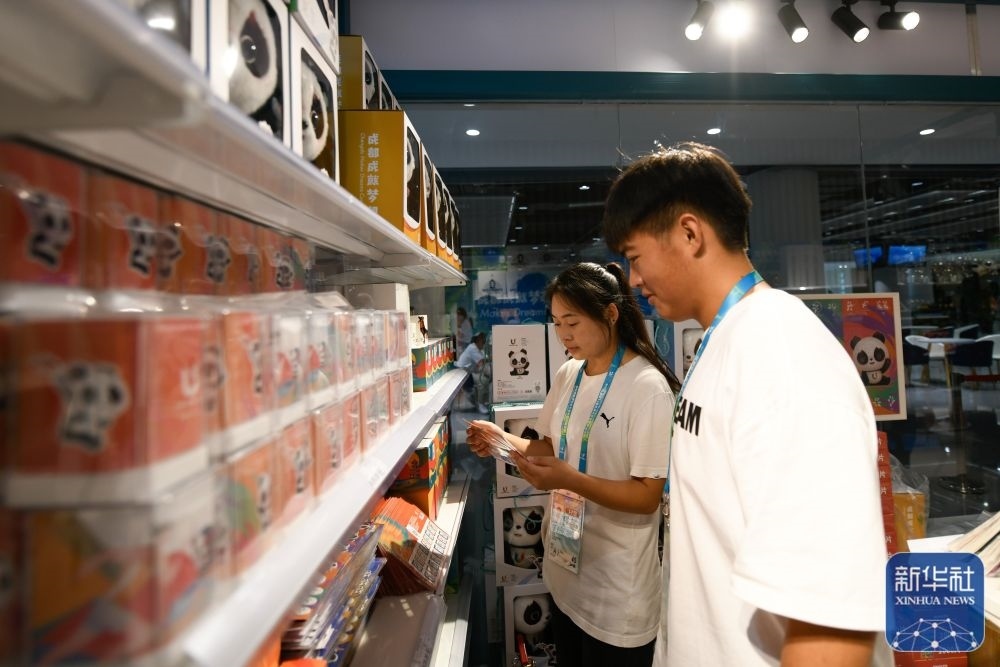 ↑7月14日,媒體工作人員在成都大運會主媒體中心大運會官方特許商品零售店內(nèi)選購紀(jì)念品。新華社記者 胥冰潔 攝