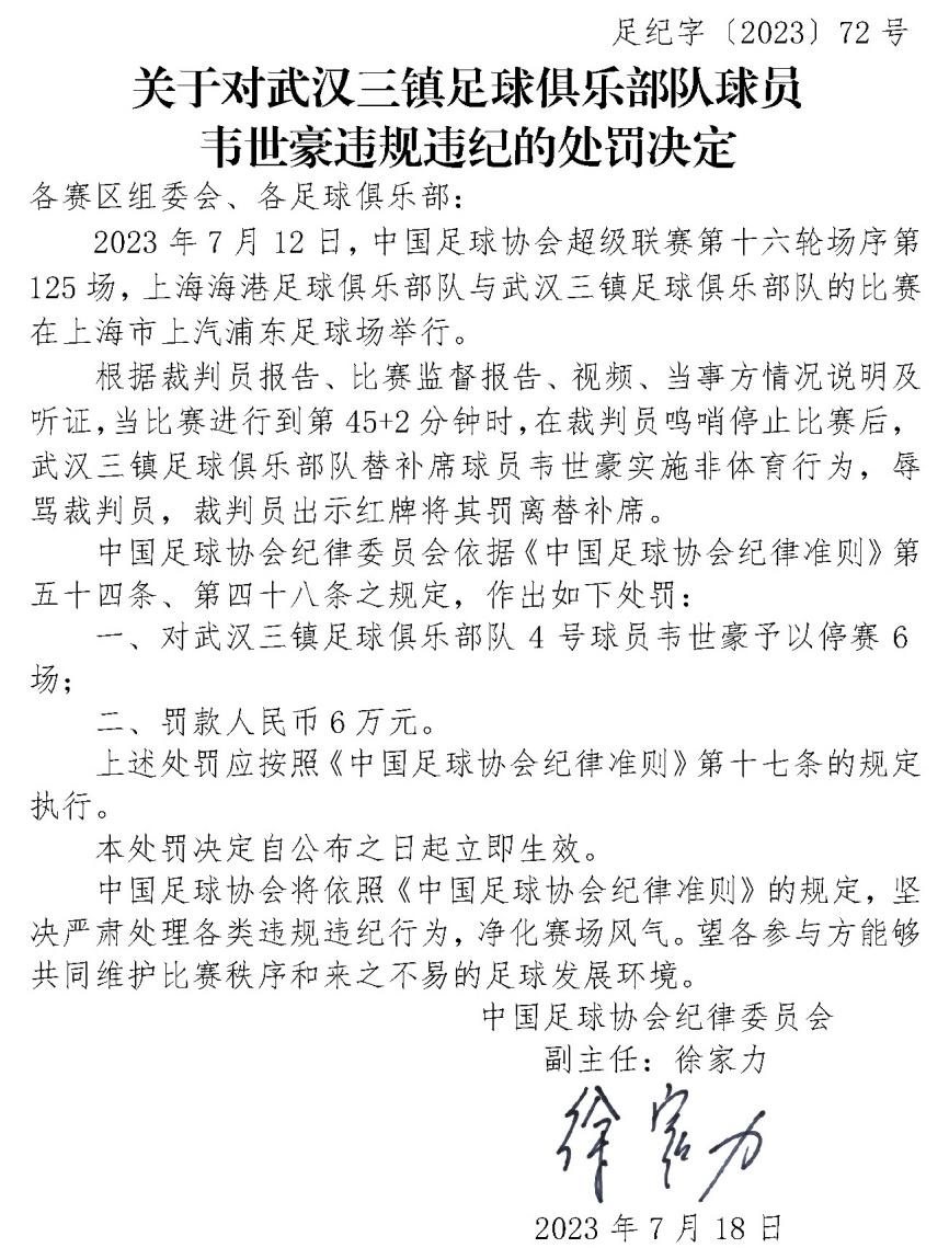 ·18日,中國足球協(xié)會紀律委員會發(fā)布重磅罰單,球員韋世豪辱罵裁判,被停賽6場罰款6萬。