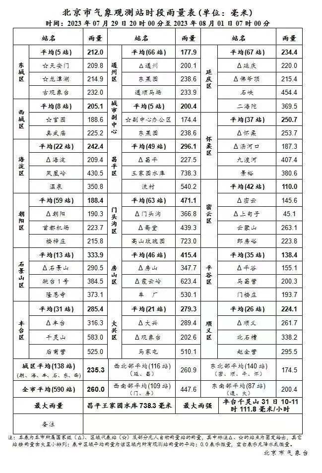 目前,北京有2站累計雨量超700毫米,分別為昌平王家園水庫738.3毫米,門頭溝高山玫瑰園723.0毫米。8月1日6-7時最大降雨出現在平谷掛甲峪31.1毫米。