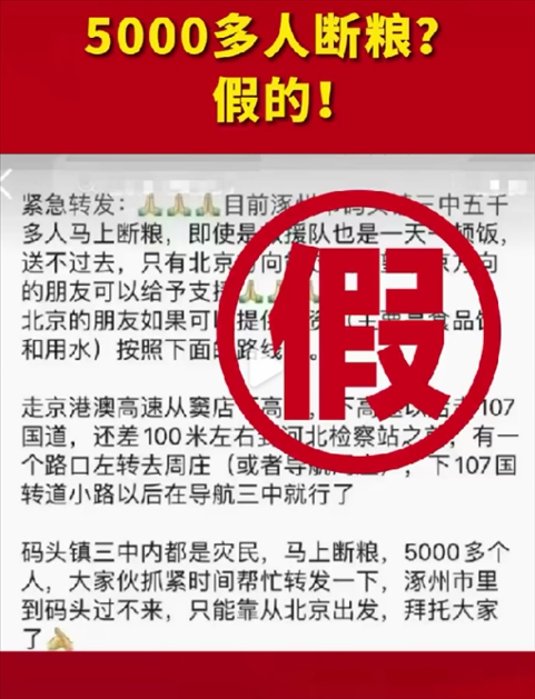 8月7日,“涿州發(fā)布”辟謠稱,網(wǎng)傳消息不實。同時,“涿州發(fā)布”還呼吁網(wǎng)民共同抵制網(wǎng)絡謠言。