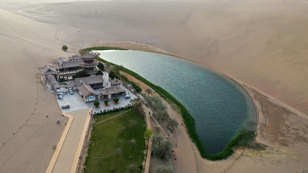 這是敦煌鳴沙山北麓的月牙泉(2023年4月24日攝,無人機照片)。新華社記者 陳斌 攝