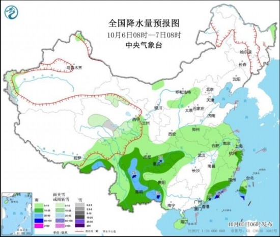 10月5日08時至6日08時,青海中西部、甘肅西部、西藏北部等地有小到中雪或雨夾雪,青海西北部局地有大雪,西藏東南部、陜西中南部、四川北部和東南部、貴州西北部、云南東北部、臺灣島等地部分地區(qū)有大到暴雨,其中,臺灣島東部部分地區(qū)有大暴雨,局地特大暴雨(250~320毫米)。內(nèi)蒙古中東部、黑龍江東北部、湖南北部、浙江等地部分地區(qū)有4~6級風。