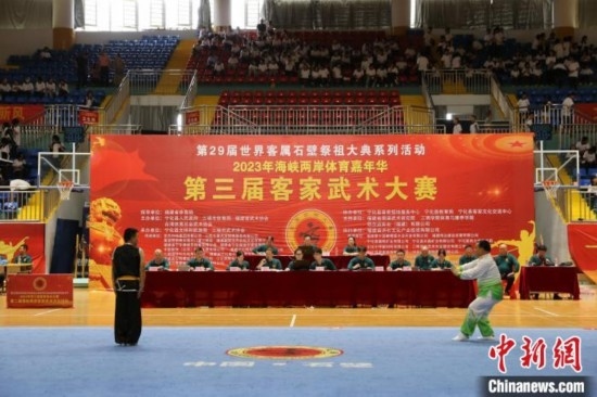 5日,第三屆客家武術(shù)大賽在福建省三明市寧化縣體育中心開賽,來自福建、江西、臺灣等地武術(shù)團(tuán)體、武術(shù)協(xié)會33支隊(duì)伍、500多名武術(shù)愛好者參加比賽。