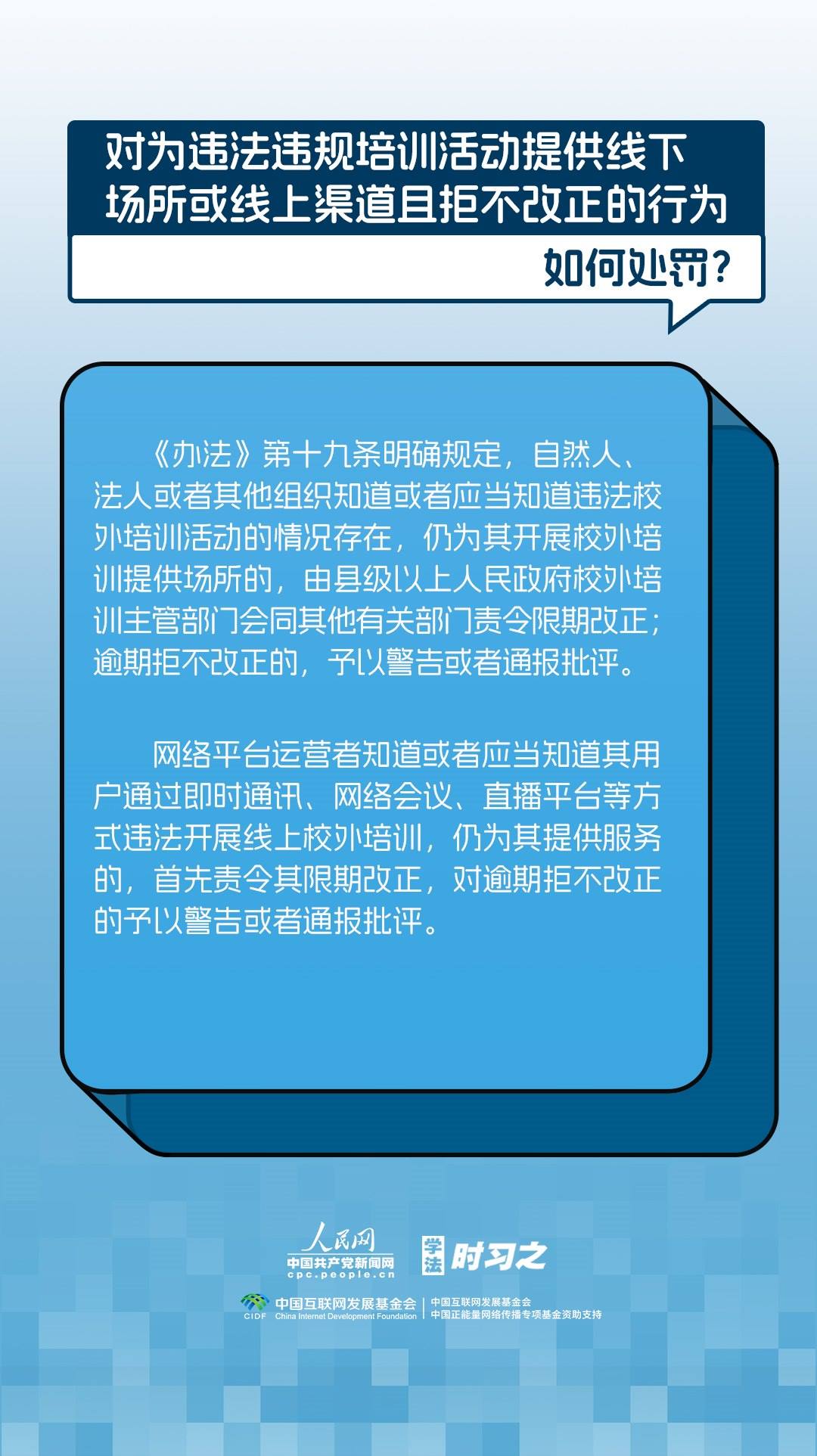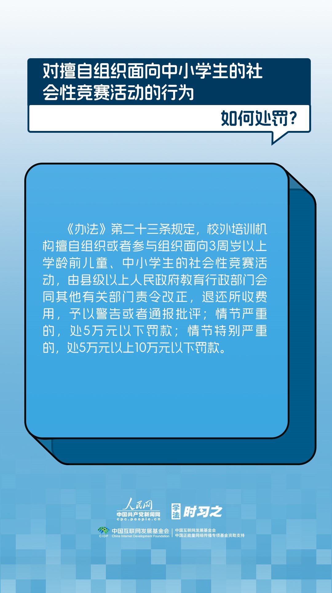 《校外培訓(xùn)行政處罰暫行辦法》(以下簡稱《辦法》)將于2023年10月15日起施行。《辦法》提出了校外培訓(xùn)行政處罰總體要求。規(guī)定適用對象為面向社會招收3周歲以上學(xué)齡前兒童、中小學(xué)生,違法開展校外培訓(xùn)的自然人、法人或者其他組織。要求校外培訓(xùn)行政處罰應(yīng)當(dāng)遵循公正、公開的原則,堅持處罰與教育相結(jié)合,引導(dǎo)自然人、法人或者其他組織自覺守法,共同抵制校外培訓(xùn)違法行為,營造有利于學(xué)生成長成才的良好環(huán)境。