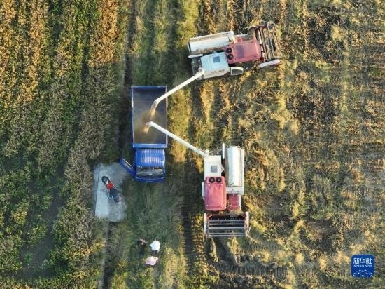 10月18日,湖南省衡陽市衡山縣白果鎮(zhèn),農(nóng)機手駕駛收割機搶收晚稻(無人機照片)。