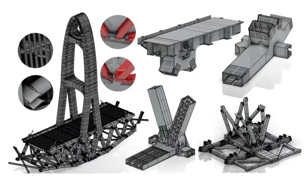 “本橋曲線鋼桁梁構(gòu)造異常復(fù)雜,鋼塔外形為半橢圓變截面,桁架近萬根桿件空間定位要求嚴(yán)絲合縫。為了準(zhǔn)確表達(dá)每個細(xì)節(jié),我們采用了BIM正向設(shè)計思路,探索出設(shè)計—建模—成圖一體化的設(shè)計流程,開發(fā)出自動化建模功能和智能化出圖系統(tǒng),為施工企業(yè)和鋼梁制造廠提供高精度的模型和批量圖紙,精準(zhǔn)表達(dá)復(fù)雜的結(jié)構(gòu)信息和設(shè)計意圖,打通了設(shè)計—制造—施工全過程信息傳遞路徑,有效節(jié)約了工期與造價?!敝需F設(shè)計集團(tuán)大橋項(xiàng)目主管總工彭嵐平向我們講述了大橋采用的最新智能化設(shè)計手段。