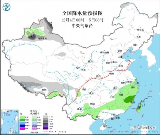 12月3日08時至4日08時,新疆北部、內(nèi)蒙古東北部、黑龍江西北部、西藏西南部和東部、川西高原等地部分地區(qū)有小到中雪或雨夾雪,其中,新疆北疆北部等地部分地區(qū)有大到暴雪,局地大暴雪或特大暴雪(30~35毫米)。江南、西南地區(qū)東部和南部、華南北部和西部、臺灣島等地部分地區(qū)有小雨,其中,湖南南部、江西中南部、福建中部、廣西東北部、臺灣島中北部等地部分地區(qū)有中雨。內(nèi)蒙古中西部等地部分地區(qū)有4~6級風。
