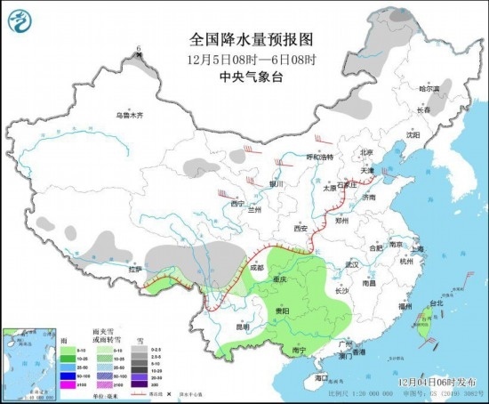 全國(guó)降水量預(yù)報(bào)圖(12月4日08時(shí)-5日08時(shí))