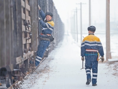 中國鐵路呼和浩特局集團有限公司呼和浩特站調(diào)車組人員在冒雪進行列車編組作業(yè)。 張 棖 王語欣攝影報道