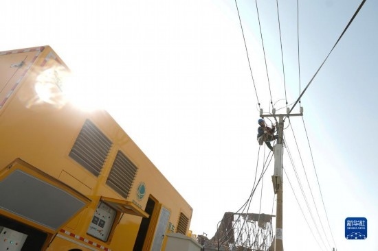 12月19日,在甘肅臨夏積石山縣大河家鎮(zhèn)大河村安置點,電力部門工作人員搶修電力設施。