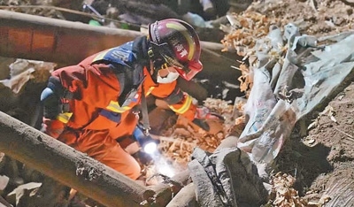 12月19日,救援人員在積石山縣大河家鎮(zhèn)進(jìn)行救援。新華社記者 張 領(lǐng)攝