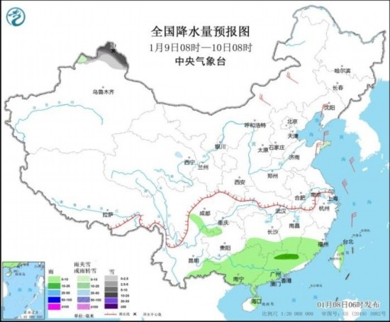 1月9日08時至10日08時,新疆西北部有小到中雪或雨夾雪,部分地區(qū)有大雪或暴雪(10~19毫米)。四川盆地南部、云南東南部、江南南部、華南大部等地部分地區(qū)有小到中雨。內(nèi)蒙古中東部、遼寧、山東半島等地部分地區(qū)有4~5級風。東海南部海域?qū)⒂?~7級風,陣風8級。