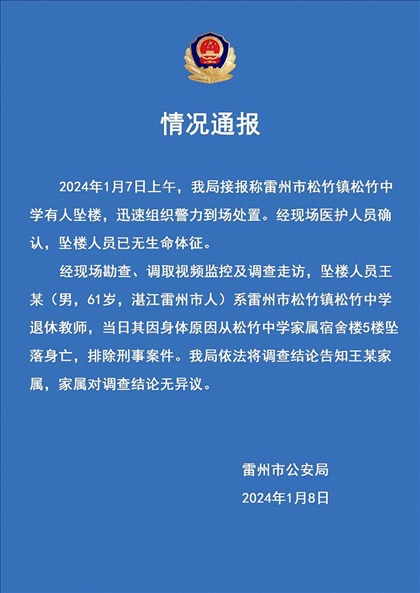 ·廣東湛江一中學(xué)老師墜樓,警方通報:排除刑事案件。