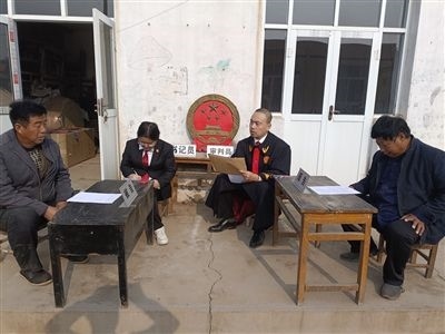 圈頭法庭法官在村委會調(diào)解一起租賃合同糾紛案。曲東哲 攝