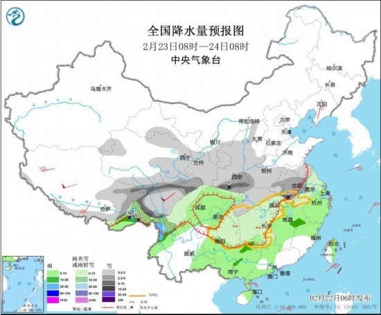 全國降水量預(yù)報圖(2月22日8時-23日8時)