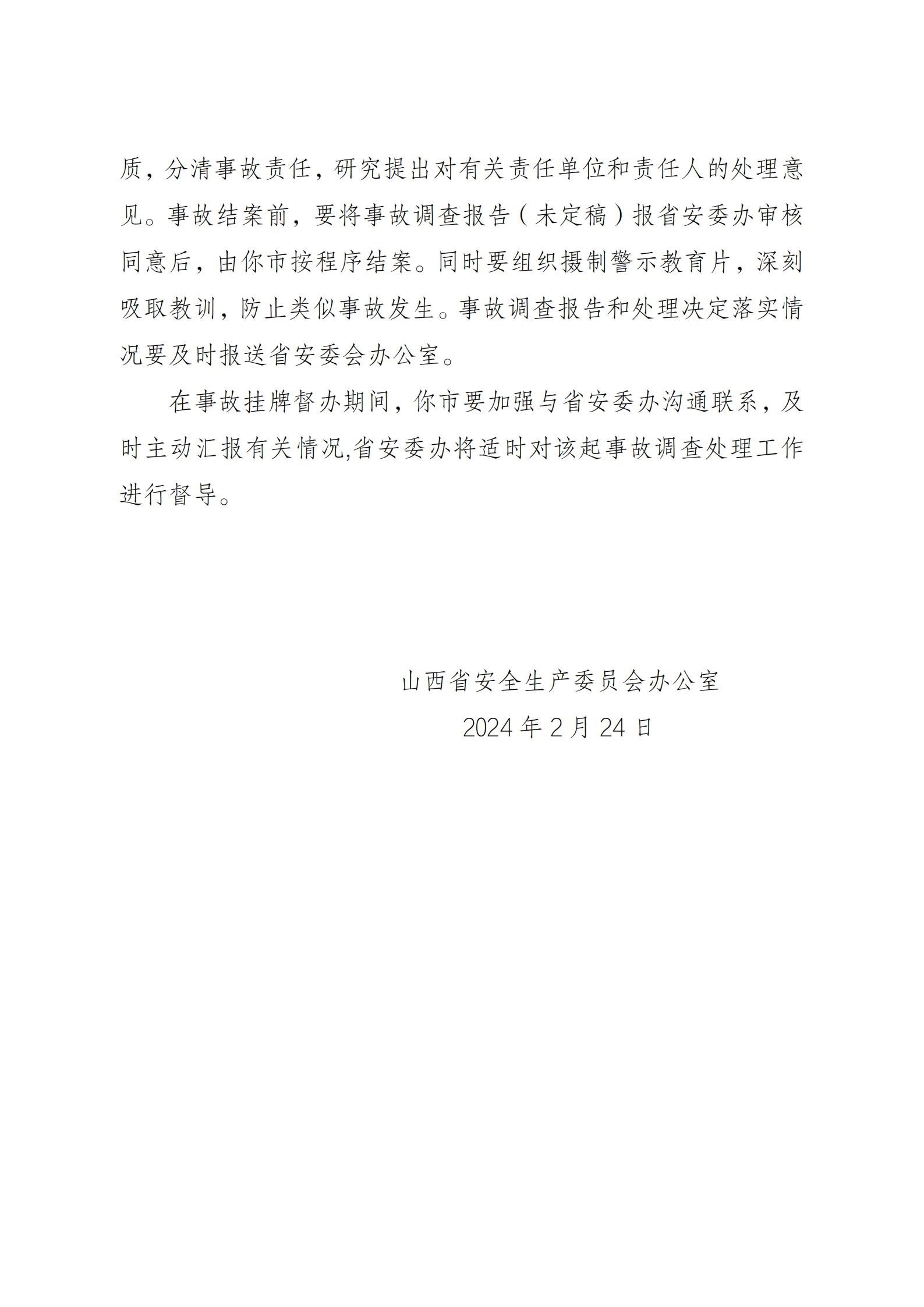 根據(jù)《國務(wù)院關(guān)于進(jìn)一步加強(qiáng)企業(yè)安全生產(chǎn)工作的通知》《山西省較大事故查處掛牌督辦辦法》等有關(guān)規(guī)定要求,山西省安委辦決定對(duì)該起事故查處實(shí)行掛牌督辦。要求呂梁市依據(jù)有關(guān)法律法規(guī)和規(guī)定,組織進(jìn)行事故調(diào)查,查明事故原因,認(rèn)定事故性質(zhì),分清事故責(zé)任,研究提出對(duì)有關(guān)責(zé)任單位和責(zé)任人的處理意見。事故結(jié)案前,要將事故調(diào)查報(bào)告報(bào)山西省安委辦審核同意后,由呂梁市按程序結(jié)案。同時(shí)要組織攝制警示教育片,深刻吸取教訓(xùn),防止類似事故發(fā)生。事故調(diào)查報(bào)告和處理決定落實(shí)情況要及時(shí)報(bào)送山西省安委辦。