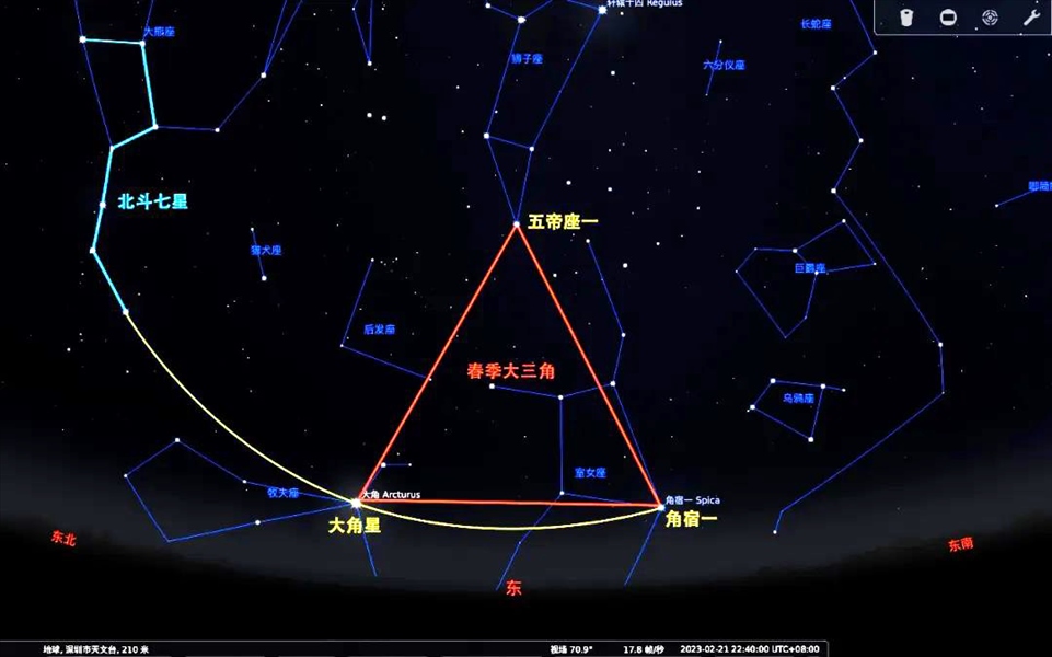 (2)沿著北斗七星的勺柄曲線進(jìn)行延伸,可以找到牧夫座α,這顆星我們一般稱之為“大角星”。