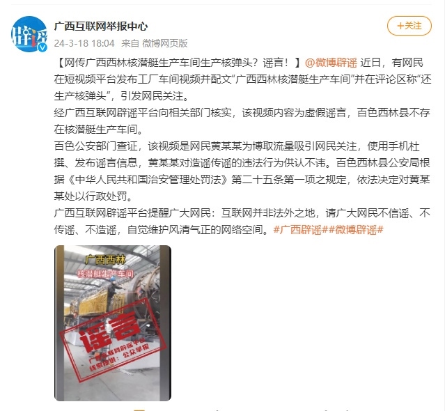 ·廣西互聯(lián)網(wǎng)舉報(bào)中心:“廣西西林核潛艇生產(chǎn)車(chē)間生產(chǎn)核彈頭”系謠言。