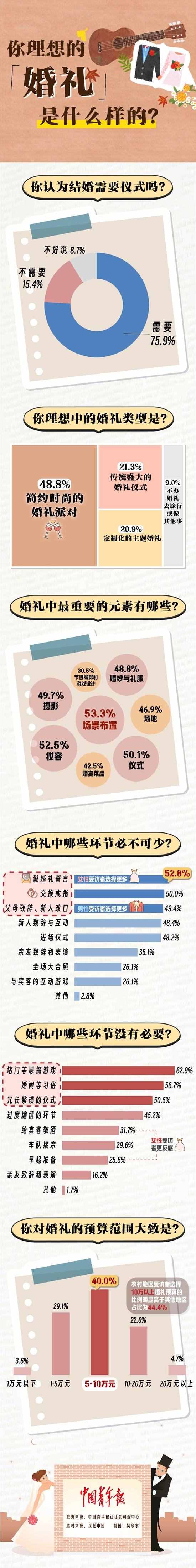 調(diào)查中,有75.9%的受訪青年認(rèn)為“結(jié)婚需要儀式”。64.2%的受訪青年認(rèn)為極簡婚禮的流行是年輕人追求個性化和自由的體現(xiàn),61.6%的受訪青年認(rèn)為是因為年輕人的觀念正在轉(zhuǎn)變,不走“排場”更重感受,51.2%的受訪青年覺得這一變化是受到了社交媒體和互聯(lián)網(wǎng)的影響。
