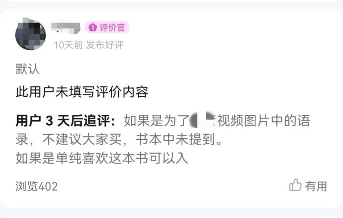 例如,在余華《我們生活在巨大的差距里》這本書的購買評論里,有人就提到,“如果是為了視頻圖片中的語錄,不建議大家購買,書本中未提到?!?/p>