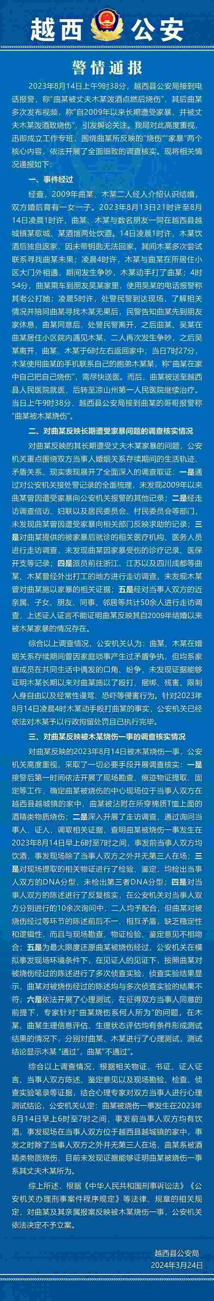 3月24日,越西縣公安局對(duì)此發(fā)布警情通報(bào)稱,綜合調(diào)查情況,根據(jù)相關(guān)物證、書證、證人證言、當(dāng)事人雙方陳述、鑒定意見(jiàn)以及現(xiàn)場(chǎng)勘驗(yàn)、檢查、偵查實(shí)驗(yàn)筆錄等證據(jù),結(jié)合心理專家對(duì)雙方當(dāng)事人進(jìn)行心理測(cè)試結(jié)論,公安機(jī)關(guān)認(rèn)定:曲某被燒傷一事發(fā)生在2023年8月14日早上6時(shí)至7時(shí)之間,事發(fā)前當(dāng)事人雙方均有飲酒,事發(fā)現(xiàn)場(chǎng)在當(dāng)事人雙方位于越西縣越城鎮(zhèn)的家中,事發(fā)之時(shí)除了當(dāng)事人雙方之外并無(wú)第三人在場(chǎng),曲某系被酒精類物質(zhì)燒傷,目前未發(fā)現(xiàn)證據(jù)能夠證明曲某被燒傷一事系其丈夫木某所為。警方表示,對(duì)曲某及其親屬報(bào)案反映被木某燒傷一事,公安機(jī)關(guān)依法決定不予立案。