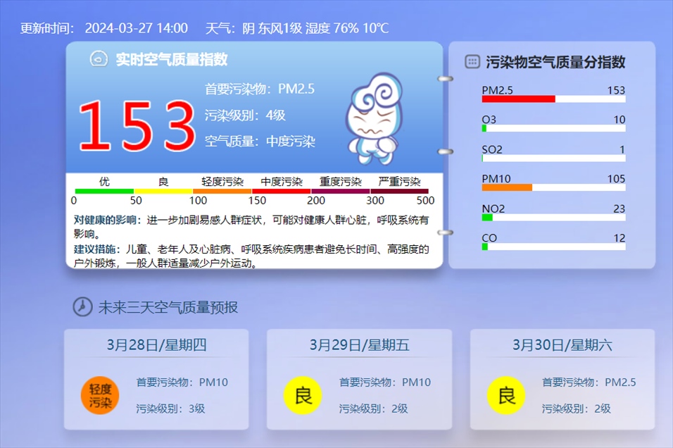 央視網(wǎng)消息:據(jù)@北京環(huán)境監(jiān)測 消息,3月27日14時,北京實(shí)時空氣質(zhì)量為中度污染,首要污染物為PM2.5,污染級別4級。