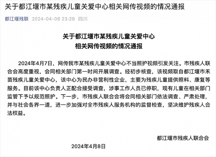 ·都江堰一康復中心殘障兒童被老師打罵?官方通報:涉事人員已停職。