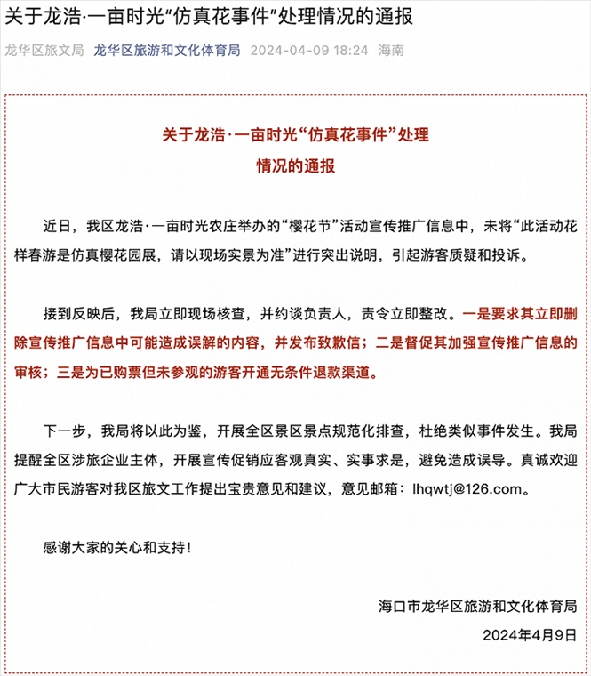 ·??谝晦r(nóng)莊辦“櫻花節(jié)”樹上全是假花?官方通報:約談責任人,責令立即整改。