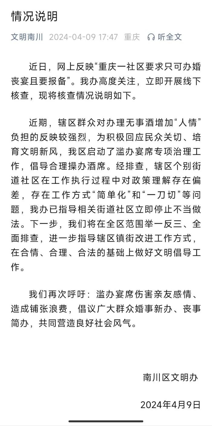 ·除了婚喪宴其他酒席都不準辦?重慶南川區(qū):不當做法,立即停止。