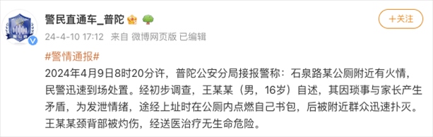 央視網(wǎng)消息:據(jù)@警民直通車_普陀 微博消息,4月9日8時(shí)20分許,上海普陀公安分局接報(bào)警稱:石泉路某公廁附近有火情,民警迅速到場(chǎng)處置。經(jīng)初步調(diào)查,王某某(男,16歲)自述,其因瑣事與家長(zhǎng)產(chǎn)生矛盾,為發(fā)泄情緒,途經(jīng)上址時(shí)在公廁內(nèi)點(diǎn)燃自己書包,后被附近群眾迅速撲滅。王某某頸背部被灼傷,經(jīng)送醫(yī)治療無(wú)生命危險(xiǎn)。
