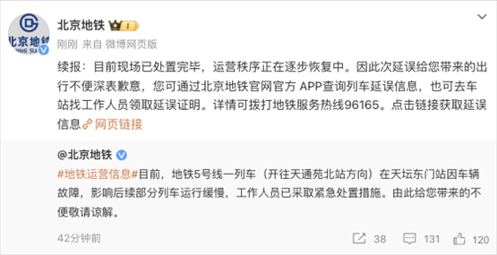 北京地鐵再通報“5號線一列車車輛故障”:已處置完畢,運營秩序正逐步恢復(fù)