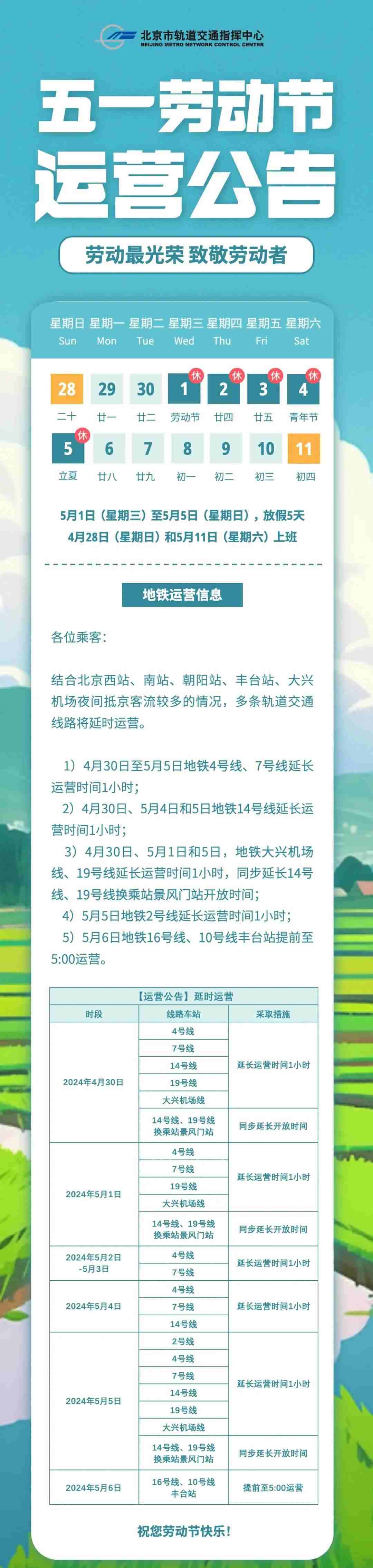 央視網(wǎng)消息:據(jù)北京軌道交通指揮中心消息,4月27日,北京軌道交通發(fā)布關(guān)于“五一”假期運(yùn)營(yíng)調(diào)整的信息提示。
