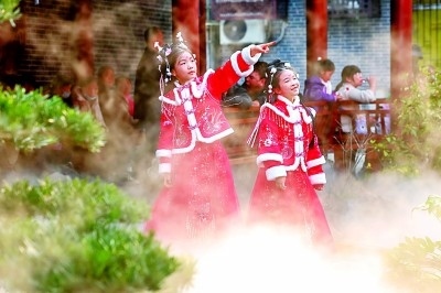兩位身著傳統(tǒng)服飾的小游客在襄陽古城游玩。楊東攝