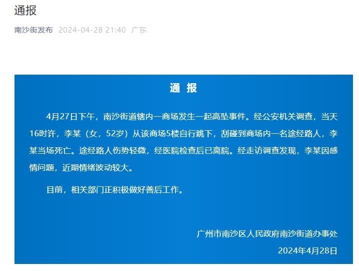 央視網(wǎng)消息:廣州南沙街道4月28日晚通報(bào),4月27日下午,南沙街道轄內(nèi)一商場(chǎng)發(fā)生一起高墜事件。經(jīng)公安機(jī)關(guān)調(diào)查,當(dāng)天16時(shí)許,李某(女,52歲)從該商場(chǎng)5樓自行跳下,刮碰到商場(chǎng)內(nèi)一名途經(jīng)路人,李某當(dāng)場(chǎng)死亡。途經(jīng)路人傷勢(shì)輕微,經(jīng)醫(yī)院檢查后已離院。經(jīng)走訪調(diào)查發(fā)現(xiàn),李某因感情問(wèn)題,近期情緒波動(dòng)較大。目前,相關(guān)部門正積極做好善后工作。