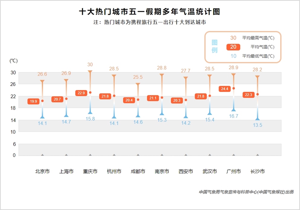 南北方熱門(mén)城市“五一”假期的氣溫差異并不大,都非常適宜出行,最高氣溫均在25℃以上。重慶是唯一一個(gè)在“五一”期間平均最高氣溫達(dá)到30℃的熱門(mén)城市,熱度與溫度都在高位,前往還需注意防暑降溫。