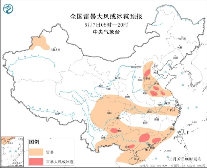 另外,今天白天,河北中部、山東西南部、河南東部、安徽北部、江蘇北部、貴州西南部、廣西中南部、廣東中北部等地的局地將有雷暴大風(fēng)或冰雹天氣,提醒當(dāng)?shù)毓娨⒁夥烙箫L(fēng)或冰雹天氣。