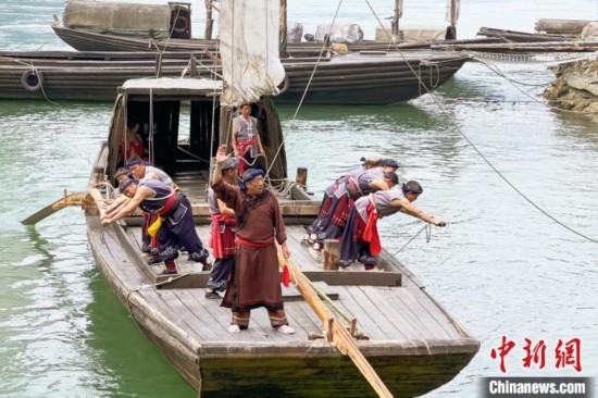 “天天拉船三峽邊吶,哎喲……”18日清晨,湖北省宜昌市三峽人家風景區(qū),隨著船夫們有節(jié)奏地搖槳升帆,峽江號子回響在長江三峽西陵峽山水間。