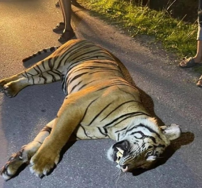 ·馬來西亞一只老虎過馬路被汽車撞死。