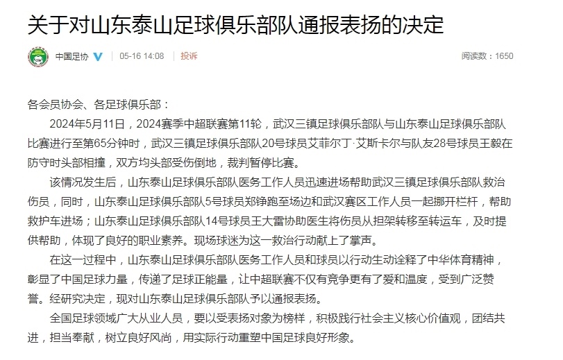 ·幫助救治武漢三鎮(zhèn)足球俱樂部隊傷員,中國足協(xié)通報表揚(yáng)山東泰山俱樂部。