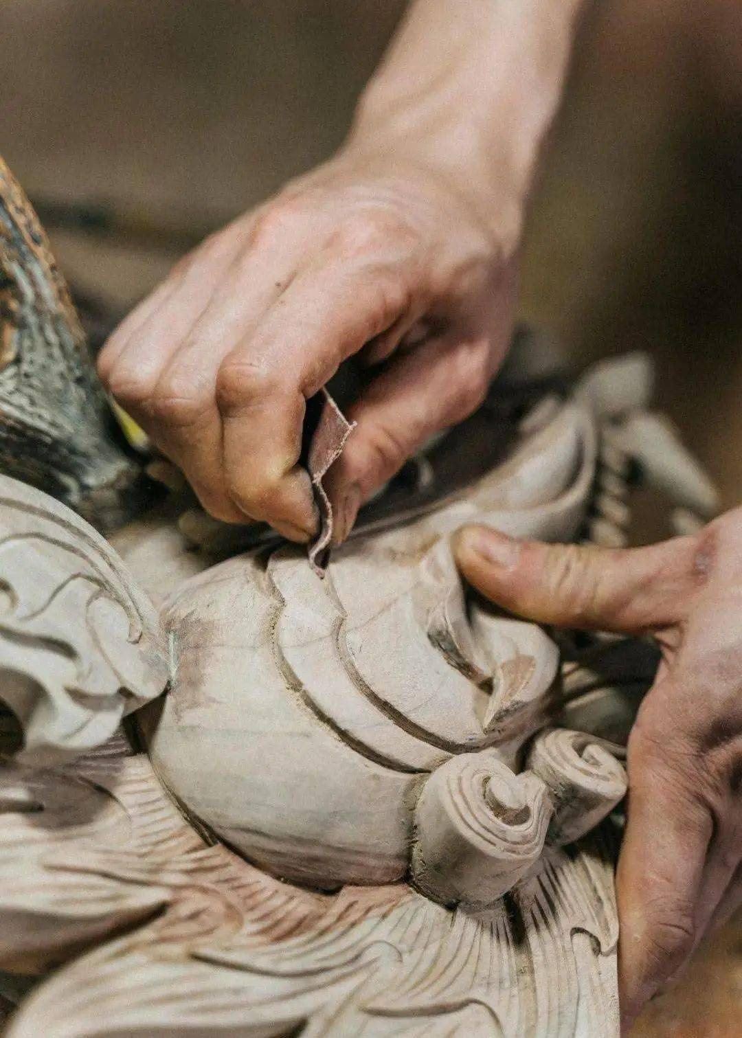 張偉潮身上的傷也沒斷過?!疤焯旄洞蚪坏?,有時候傷口剛縫了線,回到家一干活,刀口又開了”,手臂上、手背上遍布的傷疤,見證了每一個龍頭的誕生?!懊肯乱坏叮叶家呀?jīng)想好了后面的第二步、第三步”,龍頭雕刻極為考究,從選料、切割,到粗雕、精雕,再到打磨、拋光、裱漆,十幾道繁瑣工序,全靠師傅的眼光和手藝。機(jī)械化、流水線,做不出龍頭嗎?在數(shù)不清的日夜里,光影斑駁間,張偉潮拿著父輩傳下的一刀一錘,一下一下,慢慢開鑿,給出自己的答案。