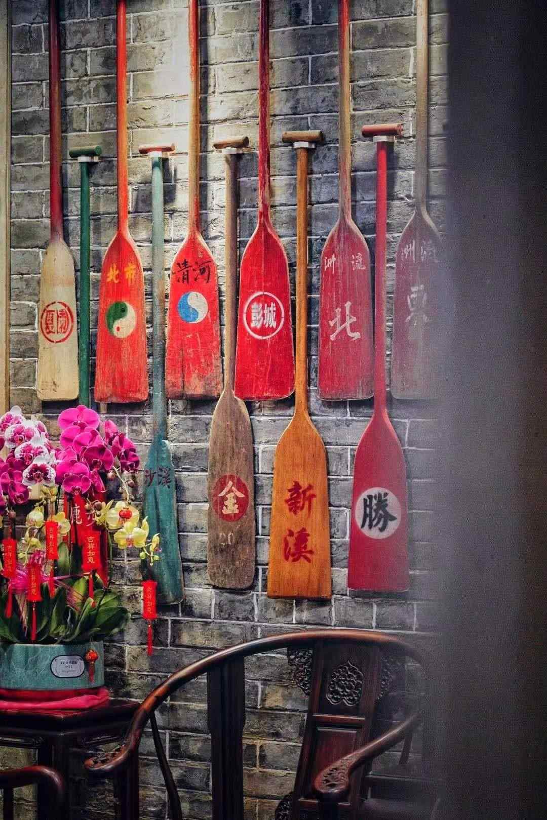 在張偉潮工作室的青磚墻上掛滿了劃龍舟所用的船槳?!皝砣↓堫^的人大多會送一面錦旗,我說不要錦旗,可以把你們不用的槳送給我?!边@些年張偉潮陸續(xù)收到了300多支船槳,在他看來,每一把槳都蘊(yùn)含著自己隊伍、村落的故事,每一把都是獨一無二的,他要把船槳當(dāng)作錦旗一樣高高地掛在墻上。