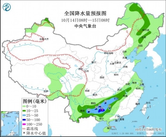 10月14日8時至15日8時,東北地區(qū)西部、云南東部、貴州南部、廣西中北部、湖南中部和西部、江西西北部等地部分地區(qū)有中到大雨,其中,云南東部、貴州南部、廣西北部、湖南西南部等地部分地區(qū)有暴雨或大暴雨(100~120毫米)。內(nèi)蒙古東北部、黑龍江西北部、新疆北部高海拔山區(qū)有中到大雪,局地暴雪。內(nèi)蒙古中部和北部、東北地區(qū)等地部分地區(qū)有5~6級風(fēng),陣風(fēng)7~8級。
