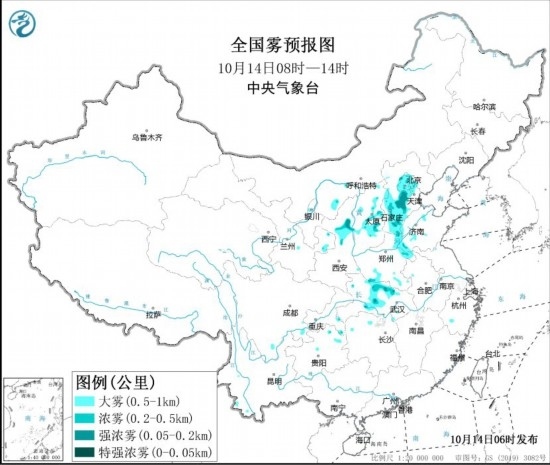 預(yù)計,10月14日早晨至上午,河北中南部、北京、天津西部、山東西部、山西中東部、陜西北部、河南東北部和南部部分地區(qū)、湖北中部等地有大霧天氣,其中,河北中南部、北京西部、山西中部、陜西北部、湖北中部等地的部分地區(qū)有能見度低于500米的濃霧,局地有不足200米的強濃霧。中央氣象臺14日06時繼續(xù)發(fā)布大霧黃色預(yù)警。此外,14日,華北中南部、黃淮中西部、汾渭平原等地大氣擴散條件較差,有輕至中度霾,其中,北京南部、河北西部沿山部分地區(qū)有重度霾。14日夜間起,受冷空氣影響,上述地區(qū)霧霾天氣自北向南逐漸減弱或消散。