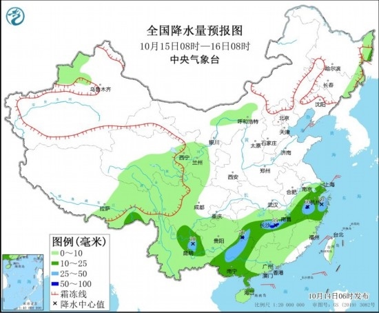 全國降水量預(yù)報圖(10月14日8時-15日8時) 圖片來源:中央氣象臺網(wǎng)站
