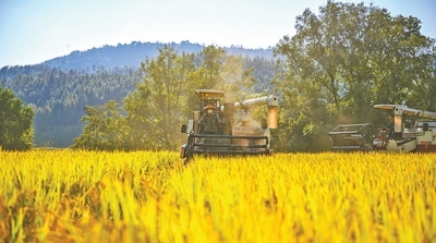 收割機(jī)正在收割黎米。