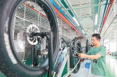 江西省九江經(jīng)濟(jì)技術(shù)開發(fā)區(qū)九江馳暢車業(yè)有限公司生產(chǎn)車間內(nèi),工人正在組裝銷往歐美市場的新能源助力自行車。魏東升攝(人民視覺)