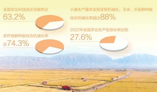 農(nóng)機(jī)為糧食生產(chǎn)護(hù)航,豐收更添底氣。目前,北斗導(dǎo)航大馬力拖拉機(jī)、氣力式高速精量播種機(jī)、乘坐式插秧機(jī)、植保無人機(jī)、玉米籽粒聯(lián)合收獲機(jī)等新型農(nóng)機(jī)廣泛應(yīng)用。全國農(nóng)業(yè)科技進(jìn)步貢獻(xiàn)率達(dá)63.2%,農(nóng)作物耕種收綜合機(jī)械化率達(dá)74.3%,小麥生產(chǎn)基本實現(xiàn)全程機(jī)械化,玉米、水稻耕種收綜合機(jī)械化率超過88%。