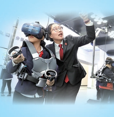 在浙江湖州市南潯區(qū)未成年人道德法治體驗館,南潯區(qū)人民法院法官(右一)指導小學生運用虛擬現(xiàn)實體驗設備接受法治教育。項 飛攝