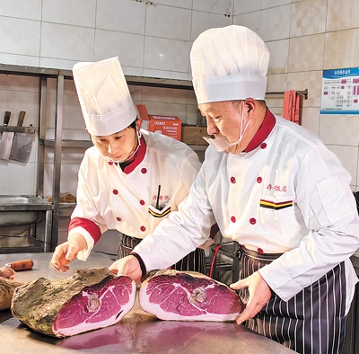 宣威市存香飯店,大廚徐天勇正忙著挑選食材,而烏金豬是制作宣威火腿的最佳原料?!半缰七^程也很重要,鹽的比例要恰到好處,多一分則咸,少一分則不夠味,經(jīng)過兩三年發(fā)酵,火腿就可以達到生吃的標準了?!毙焯煊掠霉轻樰p輕插入火腿的上、中、下部,火腿肉質(zhì)清香撲鼻,“就是它了?!?/p>